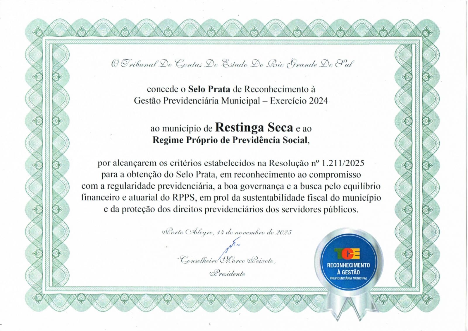 O Município de Restinga Sêca e o PREVIRESTINGA foram agraciados, no dia 14 de novembro, com o Selo Prata de Reconhecimento à Gestão Previdenciária Municpal, concedido pelo Tribunal de Contas do Estado do Rio Grande do Sul (TCE-RS). Esta é a primeira edição da premiação, que passa a ser anual e avaliou o desempenho dos RPPS gaúchos no exercício de 2024. Entre os 330 regimes avaliados, Restinga Sêca foi o único município a conquistar o Selo Prata, ficando atrás apenas de Erechim, que recebeu o Selo Ouro.